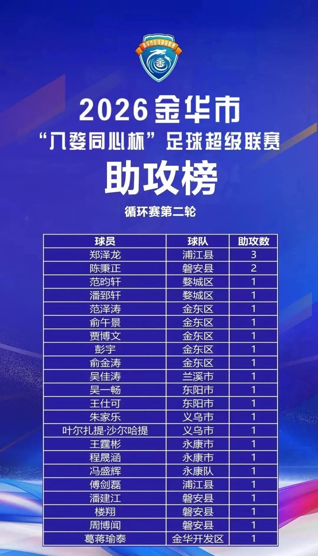 1月21日,金华市“八婺同心杯”足球超级联赛结束了循环赛第二轮的争夺。浦江队在客场2:1战胜东阳队后取得两连胜,暂居积分榜榜首。